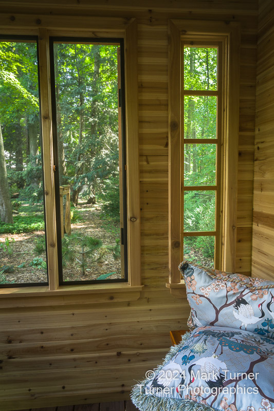 Japanese-inspired teahouse view through windows to woodland garden. Saltsman Garden, Grand Haven, MI. © Mark Turner [2403485]