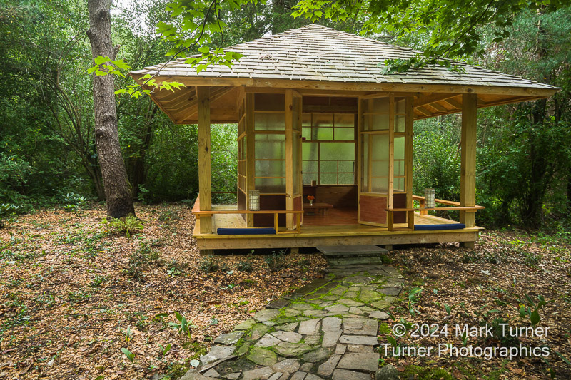 Flagstone path leads to Japanese-style teahouse in woodland setting. Private Garden, Ada, MI. © Mark Turner [2403835]